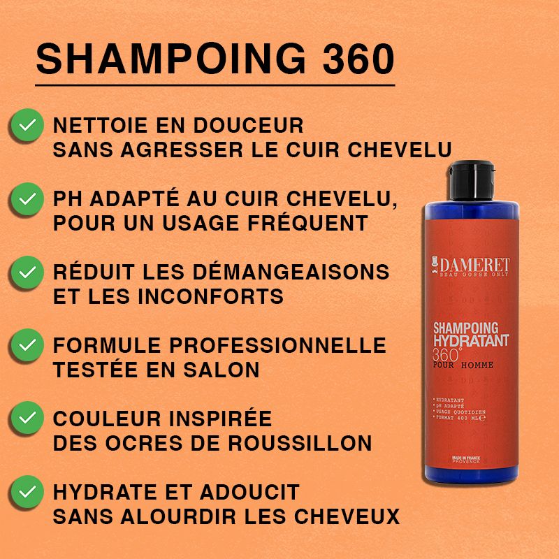 Le Shampoing Hydratant 360 DAMERET pour Homme est la solution idéale pour des cheveux hydratés et revitalisés.