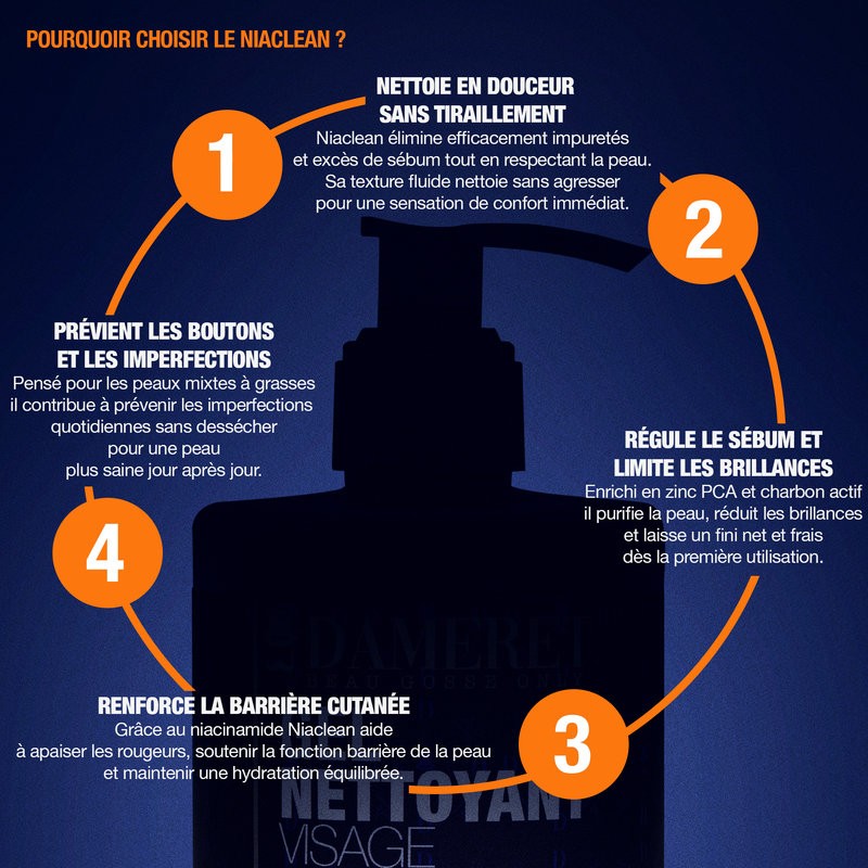 Niaclean, c’est un nettoyant purifiant nouvelle génération, associant la niacinamide, le charbon actif et le zinc PCA à un complexe postbiotique pour nettoyer, équilibrer et renforcer la peau masculine