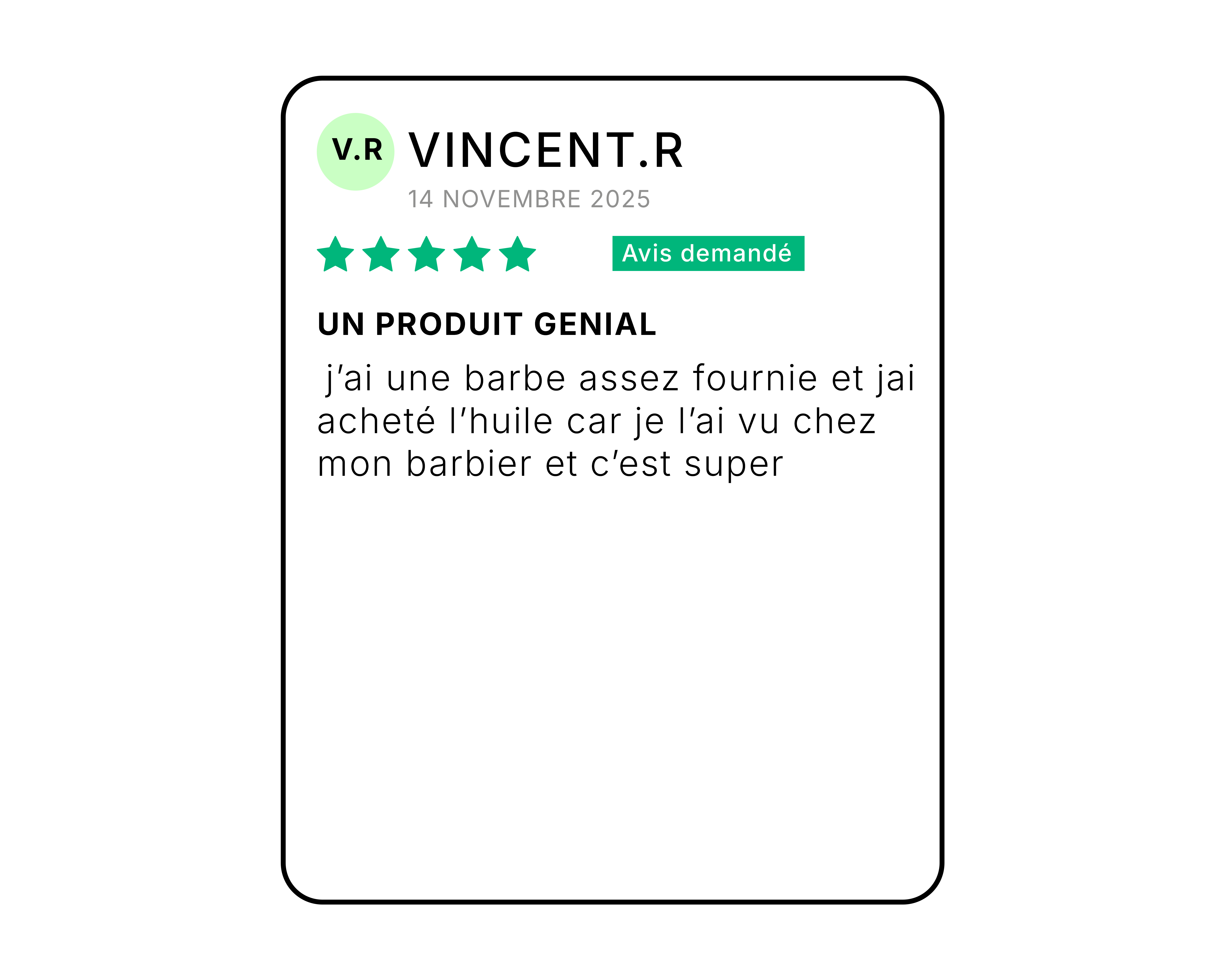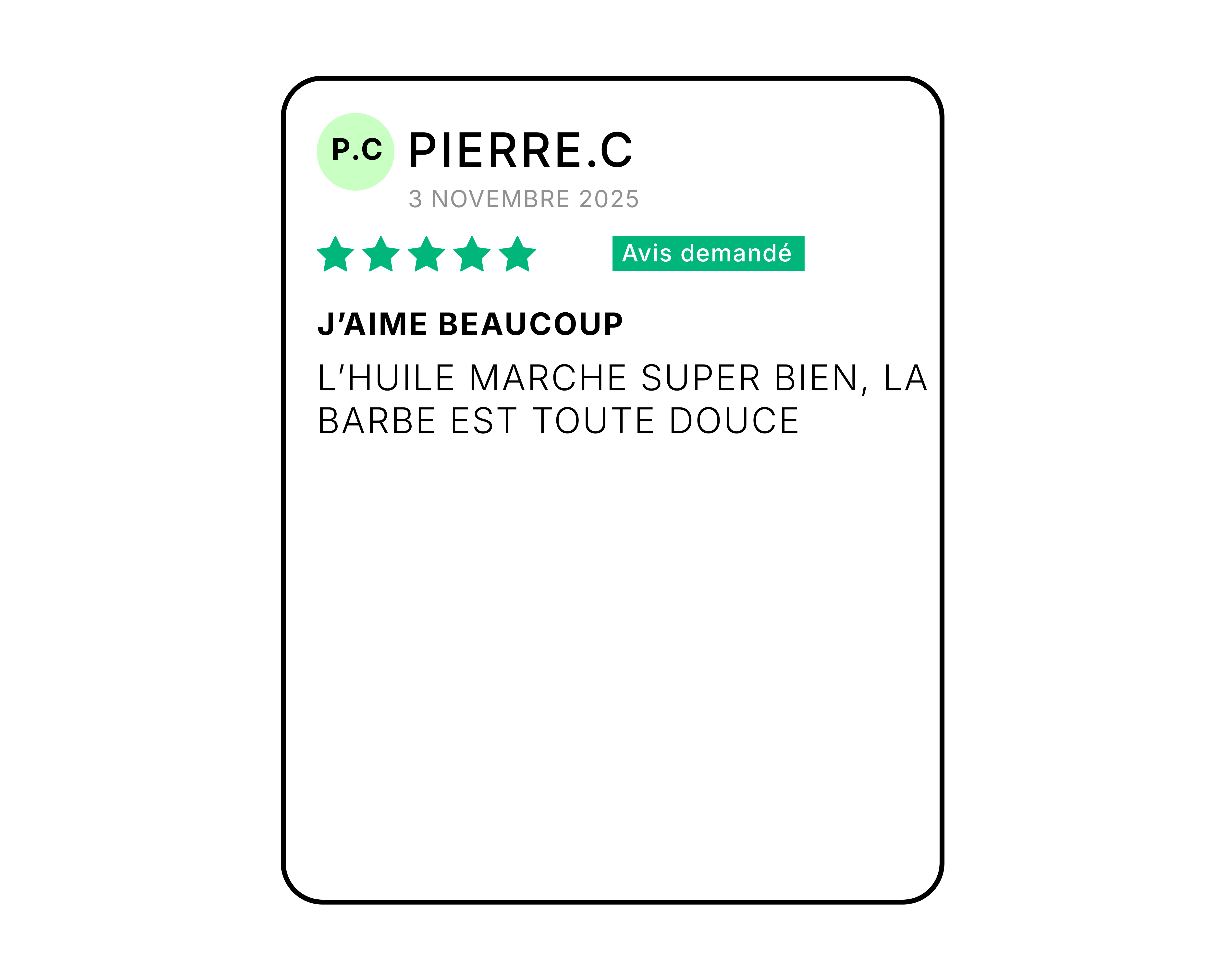 Une fois par jour suffit pour des résultats visibles. Appliquez 2 à 4 gouttes sur une barbe propre (idéalement après le nettoyant DAMERET), puis massez pour faire pénétrer sur toute la longueur et la peau sous la barbe.